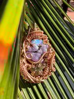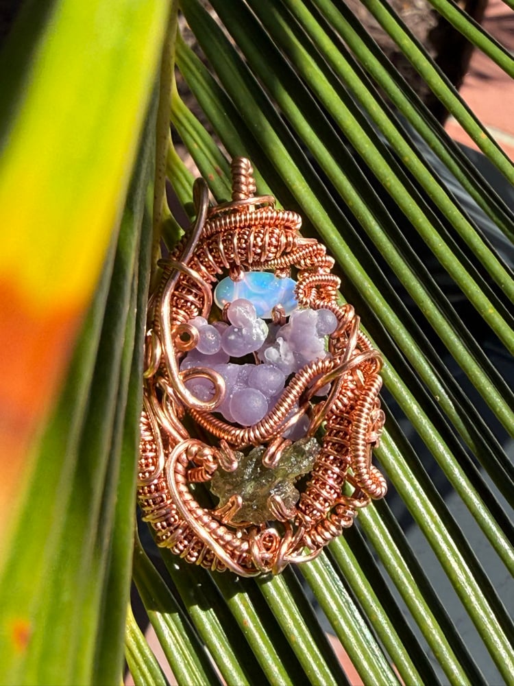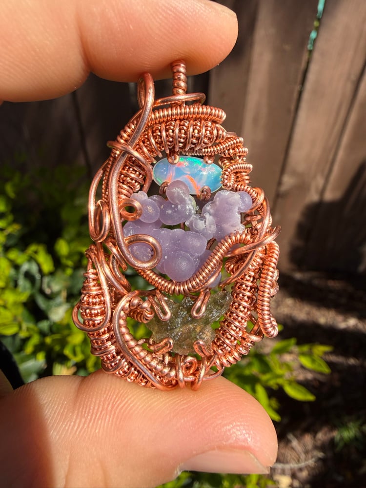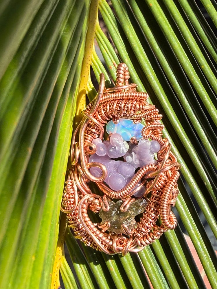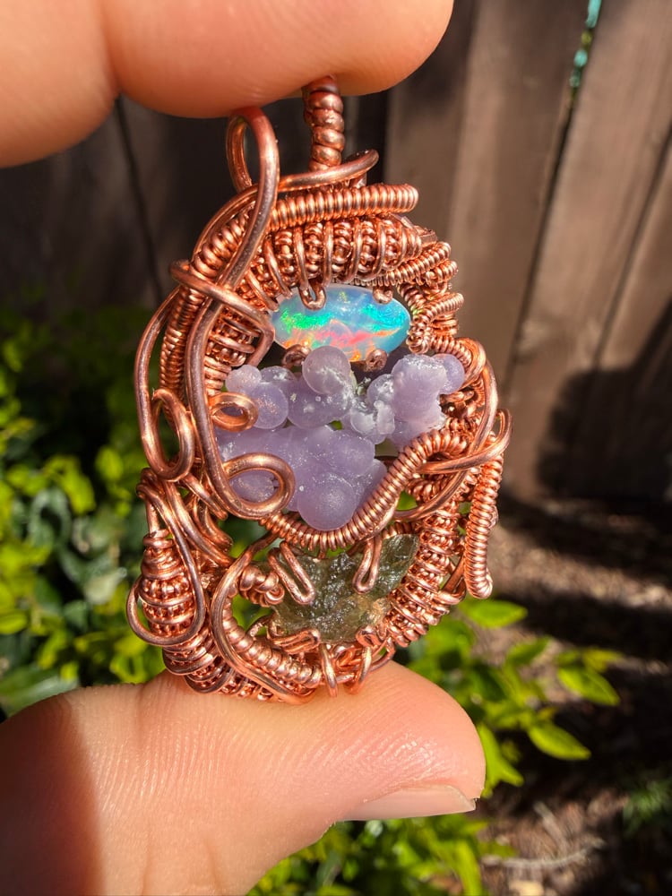 This piece features a ~1 gram moldavite, 1.5ct Ethiopian Opal & a Indonesian grape agate