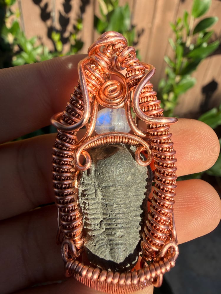 Trilobite fossil and moonstone cabochon wire wrapped in copper wire